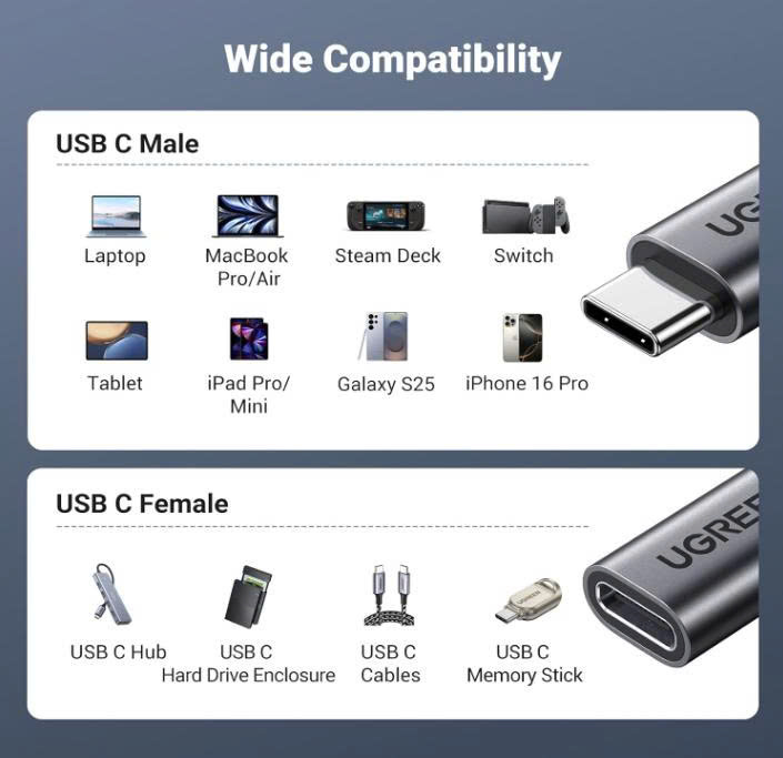 - Khả năng tương thích rộng: Dây cáp mở rộng USB 3.2 Gen 2 tương thích với iPhone 17/16/15 Plus/Pro Max, NS, iMac, MacBook Air 2024, MacBook Pro 2023, Dell XPS 17/15, iPad Air/ Pro/Mini, Pixel 9 Pro, Galaxy S24 Ultra, Huawei P60/Mate 60 Pro, v.v. Nên sử dụng với đế cắm có nguồn PD bên ngoài hoặc không cần đế cắm.