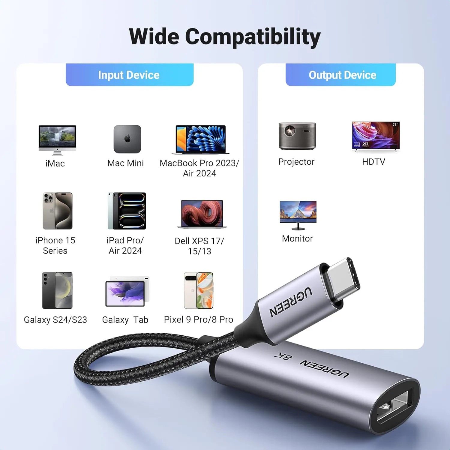 8. Tương thích với các thiết bị hỗ trợ USB-C có tính năng DisplayPort Alternate Mode như MacBook, iPad Pro, Dell XPS, Surface Book 2, và nhiều dòng laptop, smartphone khác.
