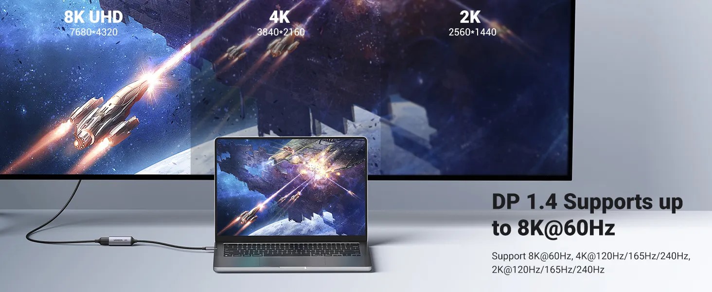 •   Cáp chuyển USB-C sang Displayport 1.4 hỗ trợ 8K@60HZ dài 10cm Ugreen 15575 kết nối điện thoại hoặc máy tính có cổng USB Type-C hoặc Thunderbolt 4/3 với màn hình có DisplayPort và không cần trình điều khiển hoặc phần mềm. Bộ chuyển đổi USBC sang DP này hỗ trợ độ phân giải lên đến 8K@60Hz (hỗ trợ ngược 4K@240Hz, 2K@240Hz), mang đến cho bạn trải nghiệm 3D chân thực. Với Dynamic HDR, bạn có thể thưởng thức những bức ảnh và video chân thực hơn với màu sắc tươi sáng hơn và độ tương phản cao hơn