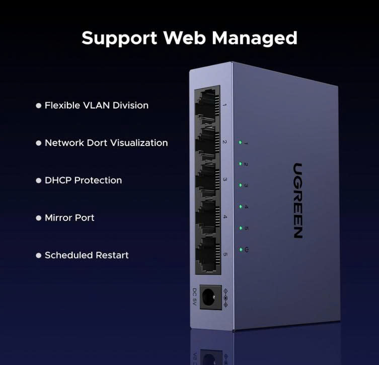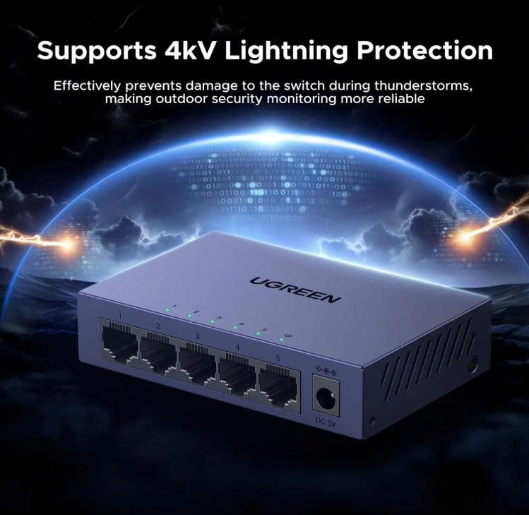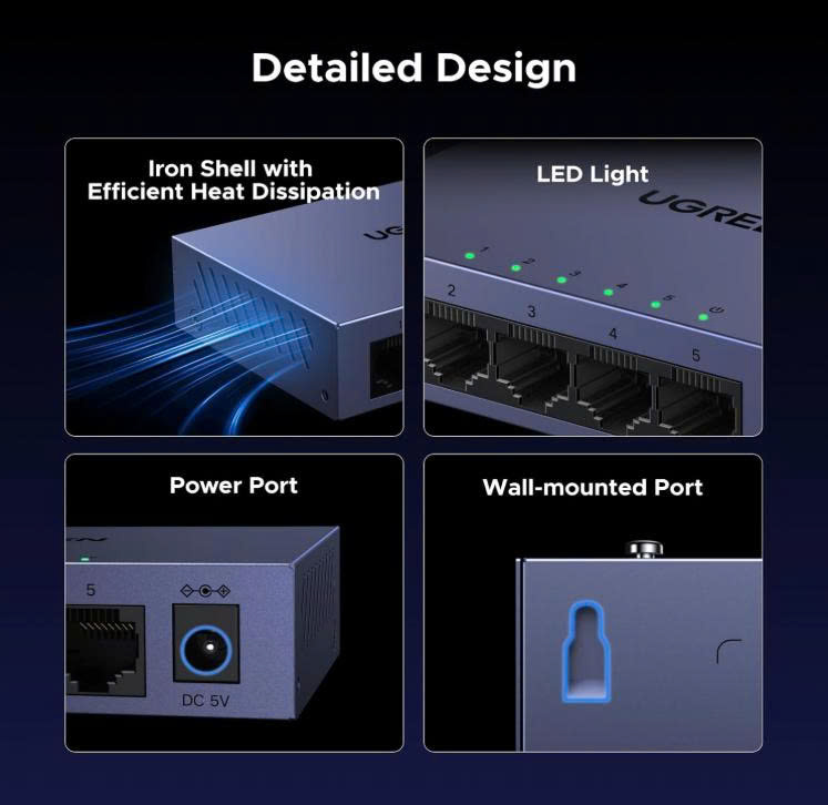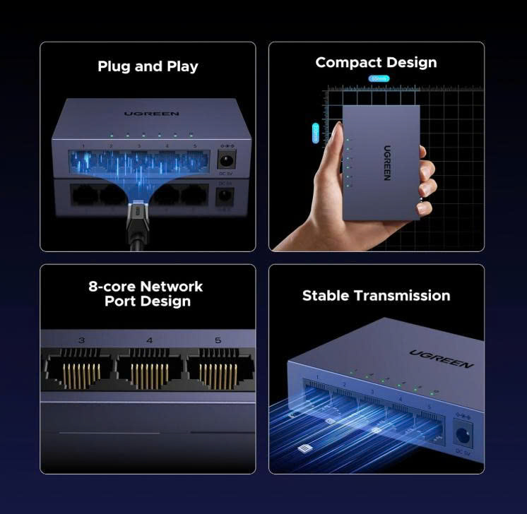 - Bộ chuyển mạch Ethernet UGREEN với 5 cổng RJ45 có đèn báo, hỗ trợ tự động điều chỉnh tốc độ mạng 10/100/1000Mbps, hỗ trợ chế độ song công toàn phần và bán song công, và hỗ trợ chức năng tự động chuyển đổi MDI/MDIX.