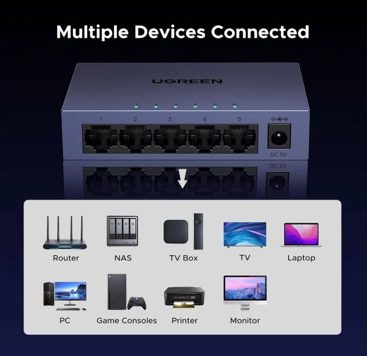 - Bộ chuyển mạch Ethernet UGREEN không cần cài đặt trình điều khiển và dễ sử dụng, đảm bảo kết nối mượt mà với nhiều thiết bị. (Không hỗ trợ PoE)